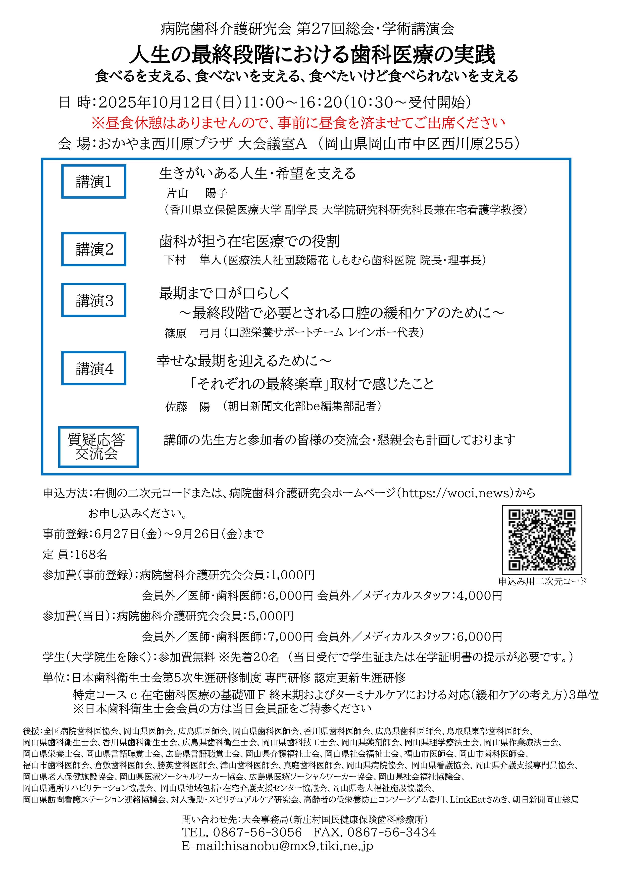 病院歯科介護研究会 Workshop on Oral Health Care of the Inpatient: WOCI は1997年に誕生しました。以来,岡山を拠点として,年1回の総会・学術講演会を通じて,病院や施設で働く歯科関係者には情報提供を,地域開業歯科関係者には当会の趣旨への賛同と参画を,そして医療関係者には口腔管理の大切さの啓蒙を行っています。